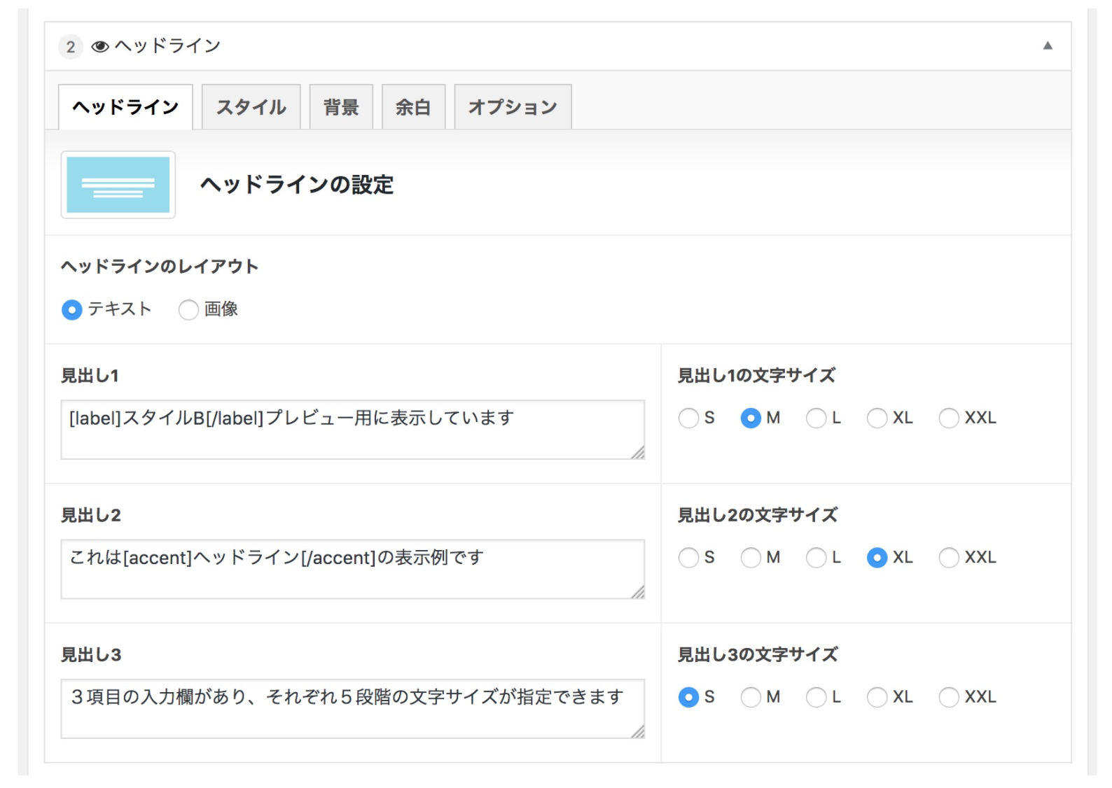 ひとつは、テキストを入力するモードです(デフォルト)。そして、もうひとつは、画像を使用するモードです。ヘッドラインを画像として作成している場合はこちらを選択して下さい。